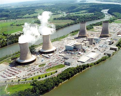 There is renewed attention in nuclear power as an energy source. Here is the KKG pressurized water plant in Northeast Switzerland, showing the reactor’s confinement dome, its huge heat exchanger stack that removes heat from the circulating water, and (to the left of the dome) the reactor’s waste gas stack that allows release of radioactive biproduct gases into the atmosphere. As with most reactors, it is by a river for extra cooling water, when needed. (Some plants, such as the one at Fukushima Japan are near an ocean and do not need the huge cooling tower structure.) This is a top down overview of a reactor power station. The questions is: Should power production “go nuclear?”