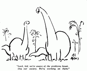 Update: 2013 Mar 31 This week I discovered the cartoonist Ed Fisher (not Ed Fischer) used the signature shown on our dinosaur cartoon, it is in his style, and I now believe it was published in the Saturday Review of Books (defunct), mid to late 1960s . It is hard to find information about him, but I believe his first name is Edwin and he died in the early 2000’s. This is not from the New Yorker magazine, and is not included in any of Fisher’s cartoon sets. There is no website about Mr Fisher to validate creative authorship.
