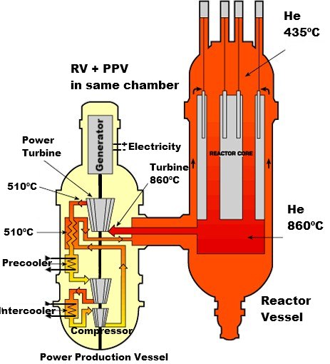 One of the (A) types is the GT-MHR designs (Gas Turbine Modular Helium Reactor). The idea probably grows from General Atomics’ analysis of the success with its small Peach Bottom reactor and the issues that kept its large Fr. St. Vrain unit from full success. These are proposed as clusters of small modules (250 MWe generators). They would be highly cost competitive due to the high build-volume envisioned. There is no inefficient intermediate coolant loop and the turbine is driven by the coolant at 850ºC; very high thermal efficiencies are expected.