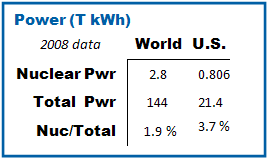 Usage Data: Information for 2008 from U.S. EIA . As a whole, the world used 144 T kWh of electrical energy. Nuclear power contributed about 1.9% of that. U.S. numbers are as shown, nuclear provided about 3.7%.
