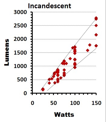 These figures are my informal (non-rigorous) review of the ILBs offered for sale today (July 2011). As you can see, there is a considerable spread in brightness for any watt you purchase. Dotted lines are hand-drawn to aid visualization. The wide spread in Lm/W at any given bulb wattage is due to the many different ways to assemble a bulb; these are manufacturing issues.
