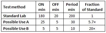 Usage A: You walk into a room in your house and turn on the light for an average of 25 minutes, then turn it off. 5 minutes later someone comes and and does the same. Usage B has be same thing but you just walk in then walk out again (closet model). 5 minutes lights on, 5 minuts lights off. In A, the lab cycle is 5.7 times longer than your usage cycle; in B, lab is 20 times longer than usage.