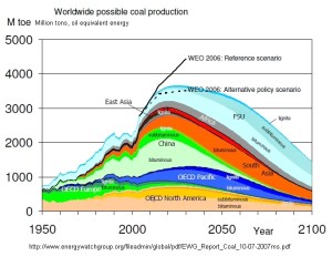 Coal – This is responsible for a quarter of the primary energy and 40% of global electrical energy. It comes in 4 types: anthracite (about 30 MJ/kg), bituminous (18.8-29.3 MJ/kg), sub-bituminous (8.3-25 MJ/kg), and lignite (5.5-14.3 MJ/kg). Peat is sometimes treated as a sub-lignite grade, but we will not concern ourselves with this. Anthacite and bituminous are called “hard coal,” at the low energy lignite end it is “brown coal.” Production for high grade anthracite peaked early in the 20th century. Coal is produced mainly in a handful of countries – USA, Russia, China, India, Australia, Germany, S. Africa, Ukraine.