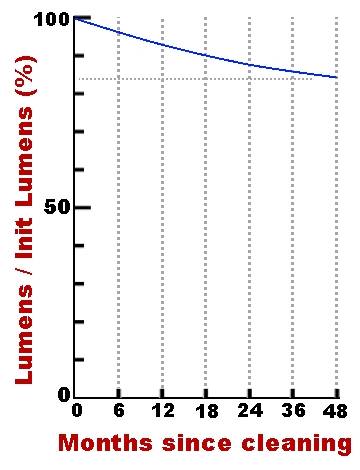 This graph is from data, but the actual light dimming for your bulb will depend on the dust/dirt in the ambient air. Multiply the LLD for your bulb by the dimming due to dirt (0.84 after 48 months of not being cleaned). This is the total light loss you will experience.