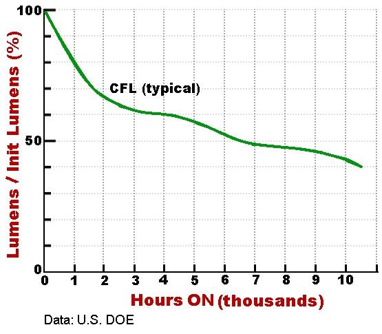 Compact fluorescent lights (CFLs) are mandated for the US market starting in January 2012. These bulbs certainly have good press; they are reputed to do wonderful things, nice green attributes. Here, we discuss probably the most serious problem with the CFL mandate: how brightness wears out for CFL bulbs.