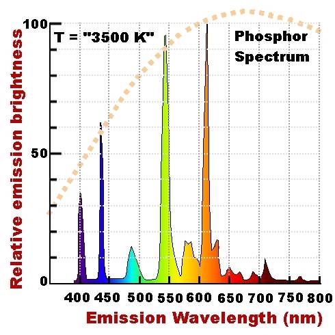 Phosphors emit visible light in discrete color bands (“lines”). For this phosphor, orange (about 540 nm) is the highest intensity with peaks of lower intensity at shorter wavelengths, down to violet (400 nm). The amplitudes of the spikes -sort of- follows the continuous amplitudes of a spectrum generated by a heated object, (see next paragraph), but this particular phosphor is missing in the red, violet is a bit too small, and there is little emission between dominant color peaks. The brightest intensity for a matching heated object (blackbody) would be deep red. It would give the feeling of warm light with reddish overtones. Our FL lamp would be more green with very little warm red.