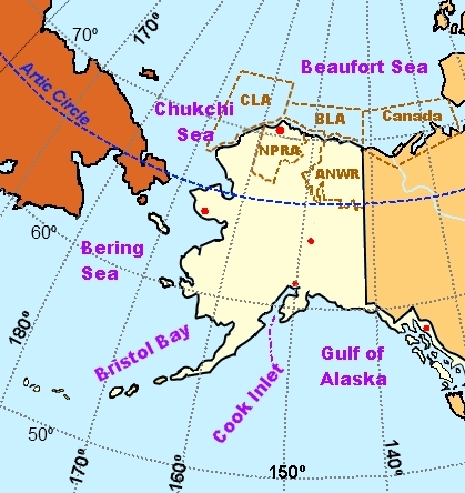 The region in U.S. and Canadian waters is shown. The 5 red dots are cities. Barrow in the North, Nome in the Wast, Anchorage is South at the end of the Cook Inlet, Juneau is in the South East. Fairbanks is near the center, close to the TAPS pipeline between Prudhoe Bay (North) and Valdez, not shown but on the shore East of Anchorage.