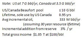 Huge profits are possible. A treasure is buried in the arctic circle, just waiting for someone to carry home. (Note: August 2011 price is about $87/bbl, so multiply 9 trillion by 0.87 for a current 7.8 trillion dollar income.) Average this over the 30 yr extraction period: 260 G$/yr. The profits from this income go straight to the corporate operators (executive staffs and boards of directors), those in the 0.1% of the population of the developed world, not to the world population in general.