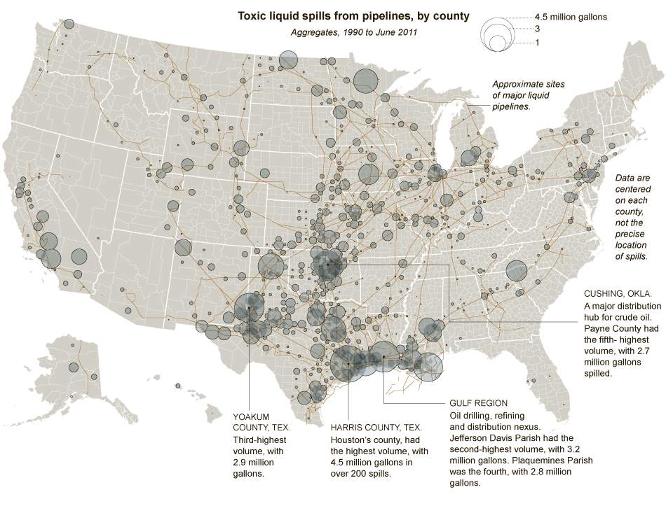 Here is only part of a New York Times graphic published under the bylines of Dan Frosch and Janet Roberts, both excellent reporters following environmental issues. In their 2011 Sep 10 report, they showed that pipeline spills are common. Click on that article for some interesting data. (For example, the Michican spill by Enbridge Energy discussed in our previous post lost over 800,000 gallons of oil and will cost over half a million dollars and well over 2 years to clean up.)