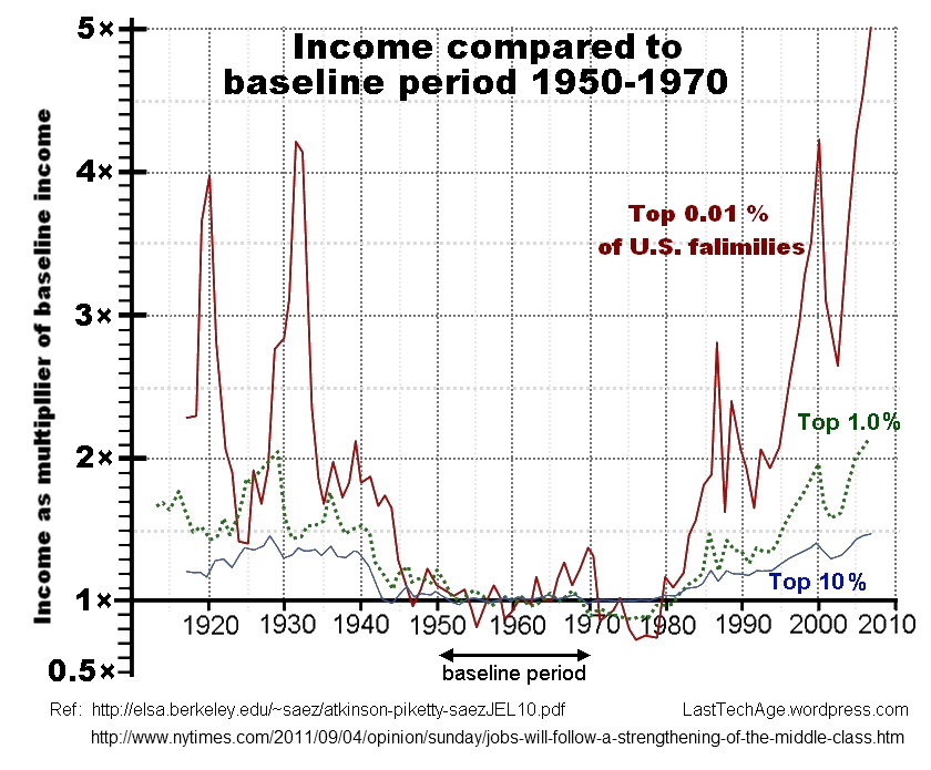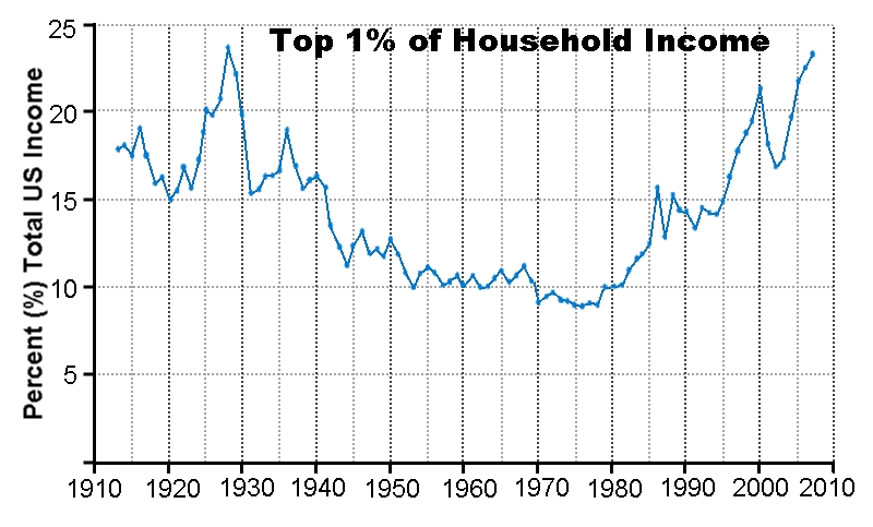 This is not actually new News: The Huffington Post had a 2009 report on wage inequality published by Prof. Emmanuel Saez (U.C. Berkley) and colleagues Thomas Piketty, Anthony Atkinson, and Facundo Alverado. Saez has led a series of academic studies, the first was for time sequence up to 1998. Saez’ UC-Berkley website should be the starting point of any discussions on this; he and his team keeps the analysis updated, although IRS data source is not available until 2 years after the labeled date.