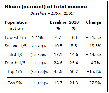 Example: During the baseline period, the top 1/5 of the households had accounted for 43.6% of the total income generated. In 2010, this had increased to over 50%. During the 30 years after 1980, their take of of the total rose by 15% while the bottom 1/5 lost nearly 22% of its share.