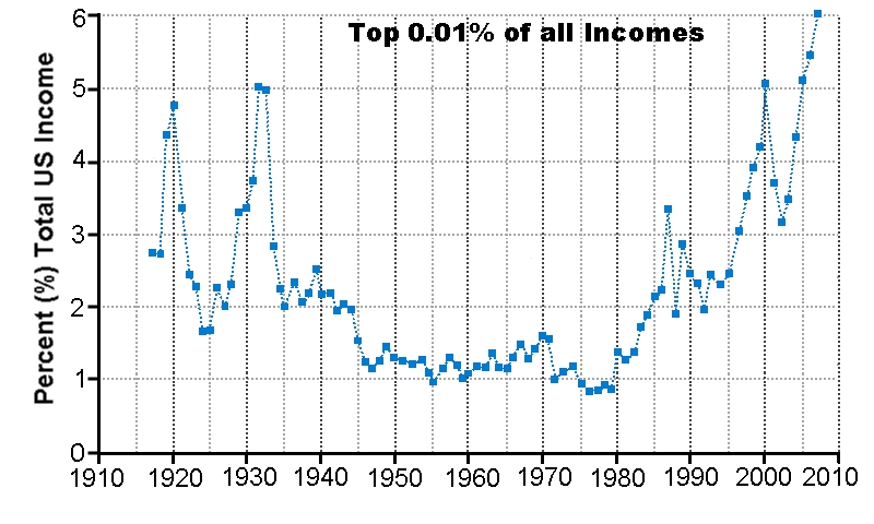 These data are from Emmanuel Saez (the top 10% and 0.01%) and Robert Reich (top 1%) and are plotted to fit nicely into the vertical graphing windows.