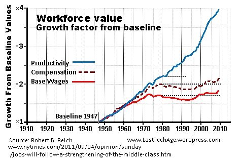 1E uses data from Dr Robert Reich . Industrial productivity maintained an ever growing increase while the base wage stagnated, finally showing a 7% growth in 2009 over the value in 1979. Total compensation was only a bit higher. Base wages, the kind that most people earn by their own efforts, flattened out during the Saudi Arabian oil embargo, but total compensation did not really start its dive until 1980 (1980 again). Part of this wage stagnation came from holding actual dollar increases to minimum possible amounts. Part due to the fact we “off-shored” much of our basic industry and workers left behind had to take (much) lower paying jobs.