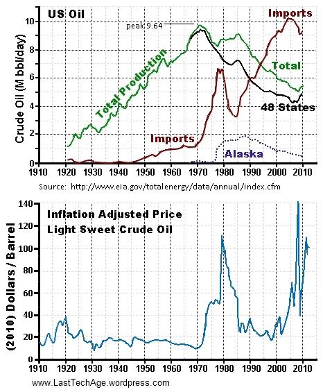 Fig 1 shows the history of US oil production for the 48 states and the Alaskan North Slope fields around Prudhoe Bay. This is similar to graphs in previous posts, but import volumes and crude oil prices are included.
