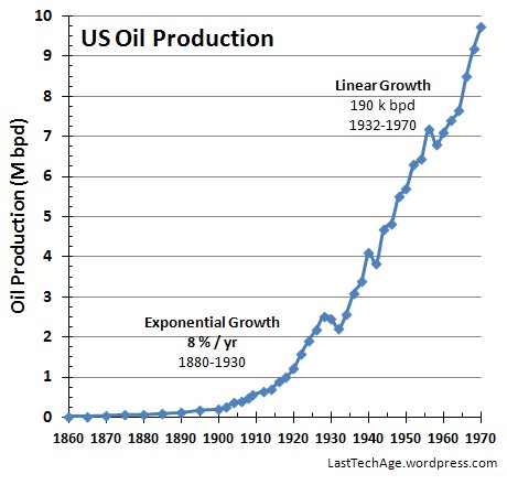 After about 1932, data is scattered about a linear growth line with an average slope of 190 thousand barrels of oil per day. This led to additional expansion up to 1970 by a factor of 4.5. Unconstrained early growth was over and the best efforts of the industry could not bring it back.