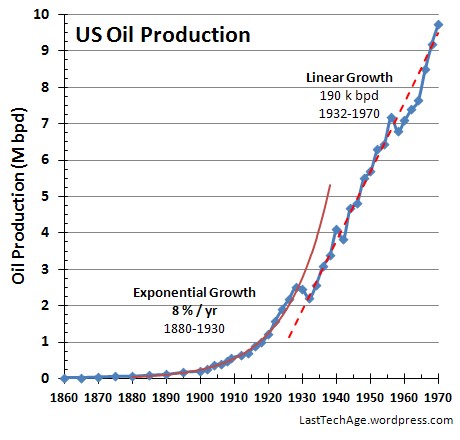 The data show that the U.S. started to reach the end of its oil boom as early as 1930. This was when production began to roll away from early exponential growth. There are signs all about that this was seen but rejected. Too much money, too many dreams were tied to the growth and indicators were not reported.