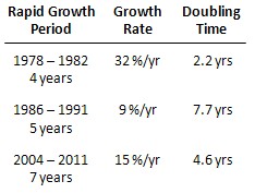 The related doubling time, TDBL, is another way to identify and characterize exponential growth. If export volume grows exponentially, then it will grow by a factor of 2 when the time TDBL passes. TDBL = ln(2)/r. Since r is the rate in decimals, a 15%/yr growth rate means TDBL = ln(2)/0.15 = 4.62 years.