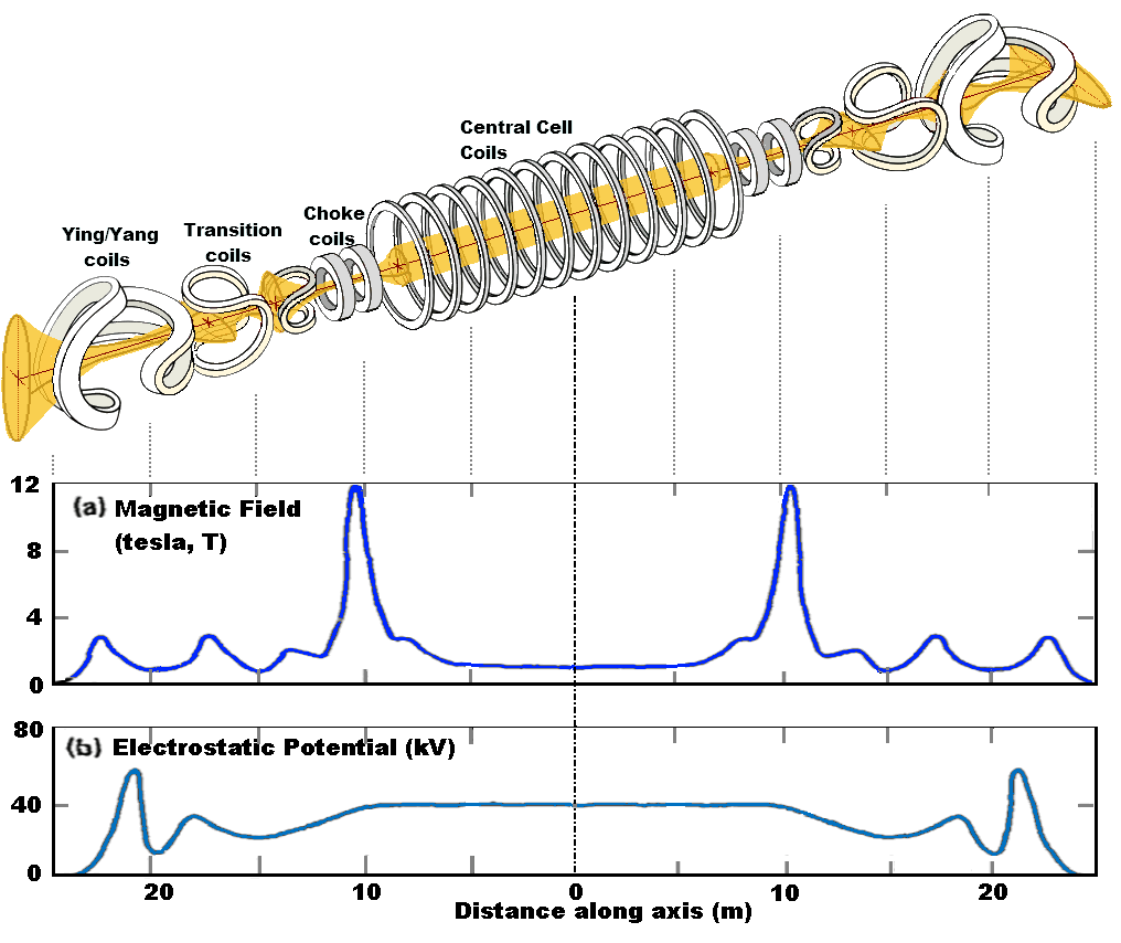 Fig 5 shows the ‘ying-yang’ confinement coil pair located at the ends of the device (Image source: LLNL). These complicated coils outside the choke coils are needed to keep the low percentage of electrons that escape the well from flowing right out the end pulling ions with them and draining the fusing central well of its fuel.