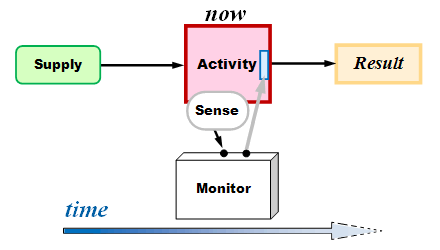 The ideal way to get the process to run smoothly would be to follow Fig 3. Monitor the (future) Result with a sensor; then send the information to the Monitor in the Now which sends control signals to a (past) Supply point where changes can make our Activity (Now) more effective. With such process feedback, we would be able to tweak events Now so that the Results are never unstable.
