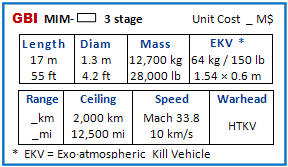 GBI is meant to stop nuclear warheads from reaching continental U.S. targets. We understand the need when we review Fig 2. Clearly, it is also meant to reach orbital stations that might pose a threat, someday. Although THAAD and SM-3 can reach midcourse altitudes, they are not fast enough for ICBMs, nor high enough for medium-high orbits.