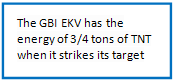 Issue #2. Once the GBI actually is operational, it will apply that kind of energy against a warhead, but it must stop inside the bomb hiding behind its re-entry shield. It must not exit out the other side. Like a riffle bullet that passes through its target, an EKV that passes through would transfer only part of its KE and may not achieve the desired result. A lot of development has been done on assault weapons, we can only hope such research has been done with HTK vehicles, too.