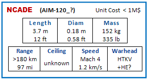NCADE uses components that make up the AIM-120 AMRAAM missile (Advanced Medium Range Air-to-Air Missile) used by most of our fighters. In fact, it really is a same-sized upgrade to the 120. NCADE would be carried by supersonic F-15, F-22 (etc.) which provide much of the missile’s attack speed.