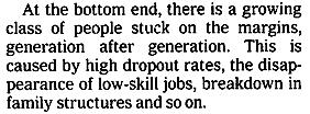 DB 1 bottom end people He says: You guys match the growing wealth of the top end 5% with the bottom end growth of people stuck at the margins.  The top end is a mix of huge compensations at Wall Street, the fact that superior people tend to marry each other, and then there is the superstar effect – superior people who achieve global gains.   His reasons why more and more people are getting stuck at the bottom is as shown.  But he contends these two are not related except through an income inequality misconception.