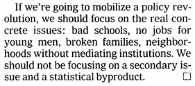 Please no secondary issuesSo… we must stay away from divisive class structure topics.  No secondary issues / statistical byproducts like class inequality.  We are going to fix a list of broad-based societal problems by not addressing root causes.