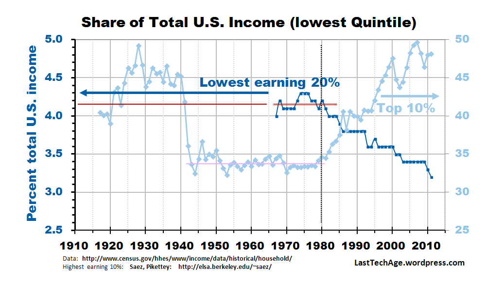 Fig 5 shows census bureau data on the lowest paid 20% of the population with the highest 10% shown in light blue, for visual correlations. Census data set started late and is noisy (they are not so interested in the lower earning levels). But it is perfectly believable that the data from the 1967-1980 are just fluctuations about a flat line, too. The lowest 20% start losing income share in 1981, when income share for the top 10% begins its spectacular rise.