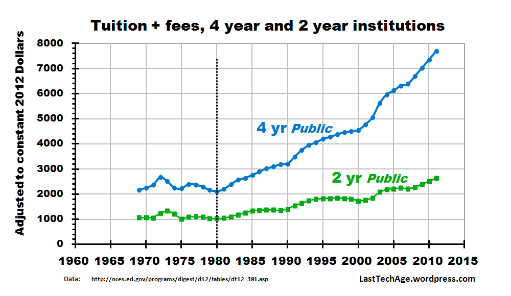Fig 2 compares the annual cost of a 2 year vs 4 year school. The upper curve is the same data as shown as the lower curve in Fig 1.  The relative flatness of the 2 year trend reflects the chart display scale, the 2 year costs actually rose more than 2½ times over 1980 costs, in constant 2012 dollars.