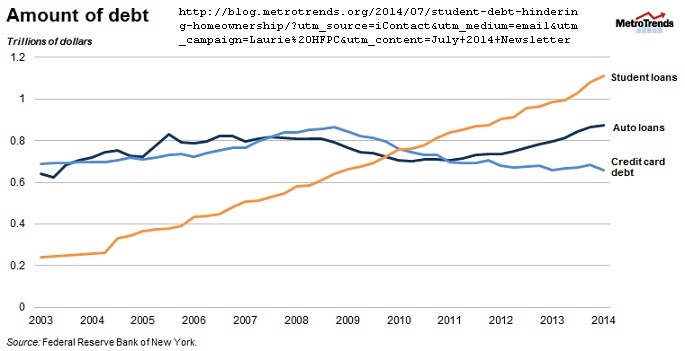 Update 2014 Jul 27:   Maia Woluchem and Taz George  published a report on the Urban Institute’s  Metro Trends  blog that included this chart of the steady rise of student debt (rising diagonal on this chart).  They show 2014 debt at $1.1 U.S.-trillion, slightly different from our 1.2  Very good short write-up.