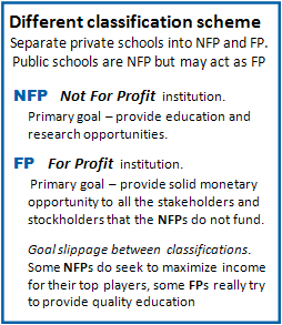 NFP-FP_def Not-For-Profit  vs.  For-Profit.   One difficult post-secondary category separates FP from the NFP institutions.  FP education is a territory inhabited by predatory organizations, what used to be called “diploma mills,” though not all FP schools are diploma mill predators.