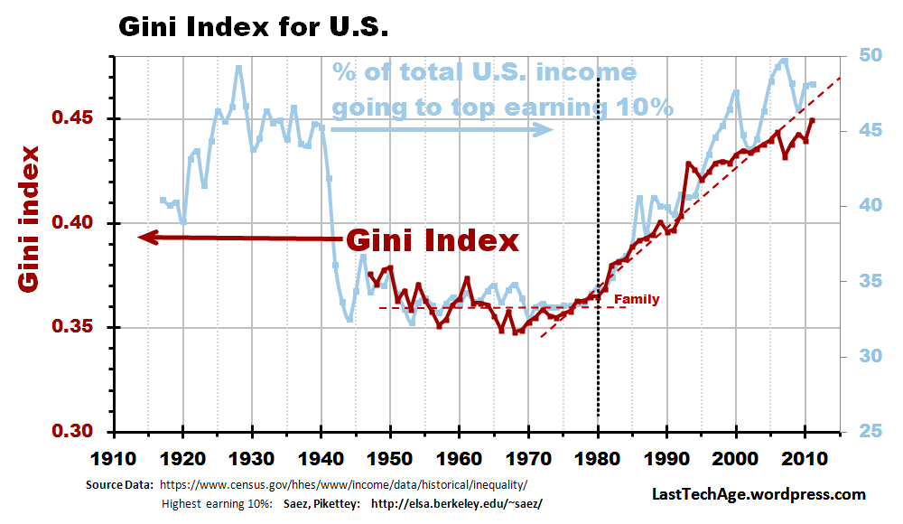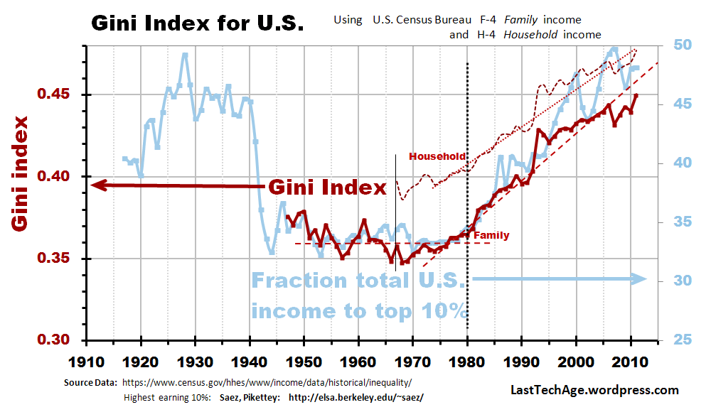 SPI studies began (in America) with Saez’ 1999 work, and was recently publicized by Thomas Piketty’s book, Capital In The Twenty First Century (C21). Emmanuel Saez provides a much longer timeline and the USCB’s Gini data. The SPI curve has a “hockey stick” shape, with a sudden bend at the key time of 1981. (Piketty usually describes this bend as a “U-shaped curve.”)