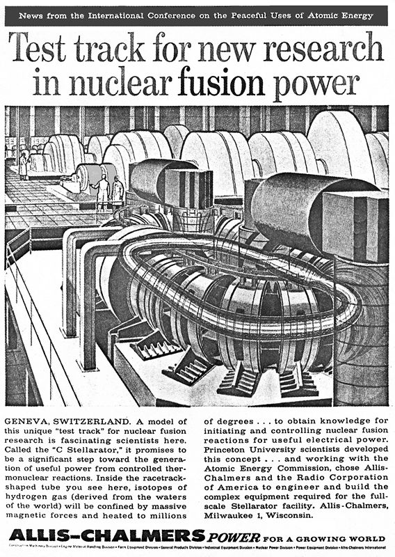 Fig 2 is an advertisement in the Scientific American magazine of October, 1958. This is the issue with Lyman Spitzer’s first popular science article on his stellerator device. Notice the size of the technicians far in the back.