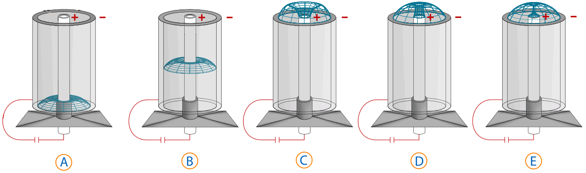3A A capacitor switches a high voltage across a hollow cylinder (cathode) and a central rod (anode), causing an arc between electrodes. (LPPF uses a circle of rods for its cathode. The LPPF anode is a rod with a central cavity to accept the jet from step 4D.)
