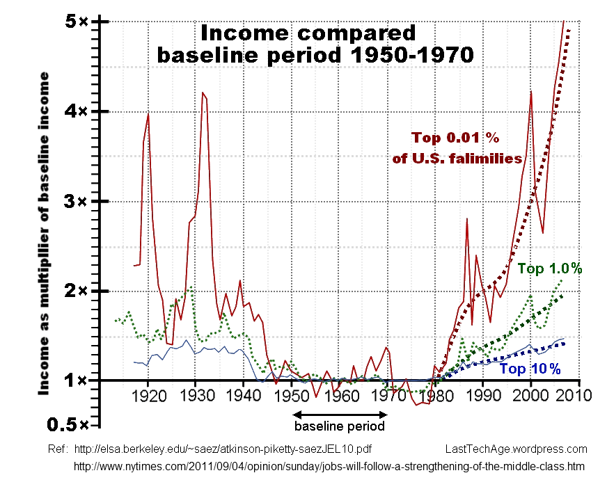 What we have become… The share of the total by the top earning 10% of households grew to about a quarter more than its baseline value (1.25× bigger). The topmost 0.01% saw their fraction rise by a factor of five (400%).